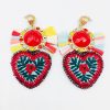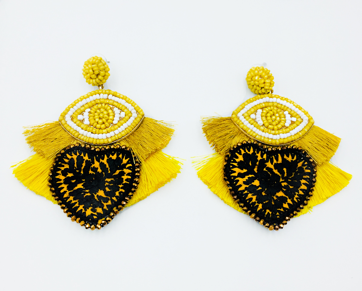 ARETES DE CORAZÓN BORDADO A MANO CON TÉCNICA DE SAN ANTONINO CASTILLO VELASCO, OAXACA, CON OJO TURCO EN CHAQUIRA, ESCOBILLAS ALREDEDOR EN FORMA DE ABANICO. ACABADOS METÁLICOS DE BISUTERÍA.