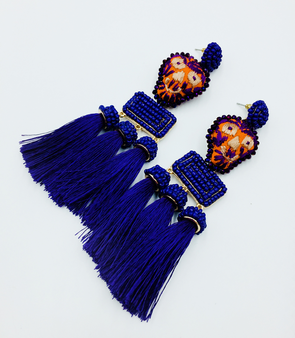 ARETES DE CORAZÓN BORDADOS A MANO CON TÉCNICA DE SAN ANTONINO CASTILLO VELASCO, OAXACA CON DIJE DE CONCHAS Y CRISTALES.
