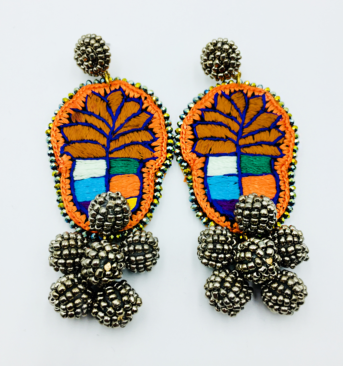 ARETES DE PIÑA BORDADOS A MANO TÉCNICA DE JALAPA DE DÍAZ, OAXACA Y CÍRCULOS DE CHAQUIRAS, ACABADOS METÁLICOS DE BISUTERÍA.