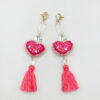 ARETES LARGOS DE MADERA CON CORAZONES DECORADOS CON TÉCNICA DE ALEBRIJE. ACABADOS METÁLICOS DE BISUTERÍA.