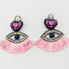 ARETES DE CORAZÓN BORDADO A MANO CON TÉCNICA DE SAN ANTONINO CASTILLO VELASCO, OAXACA, CON OJO TURCO EN CHAQUIRA, ESCOBILLAS ALREDEDOR EN FORMA DE ABANICO. ACABADOS METÁLICOS DE BISUTERÍA.