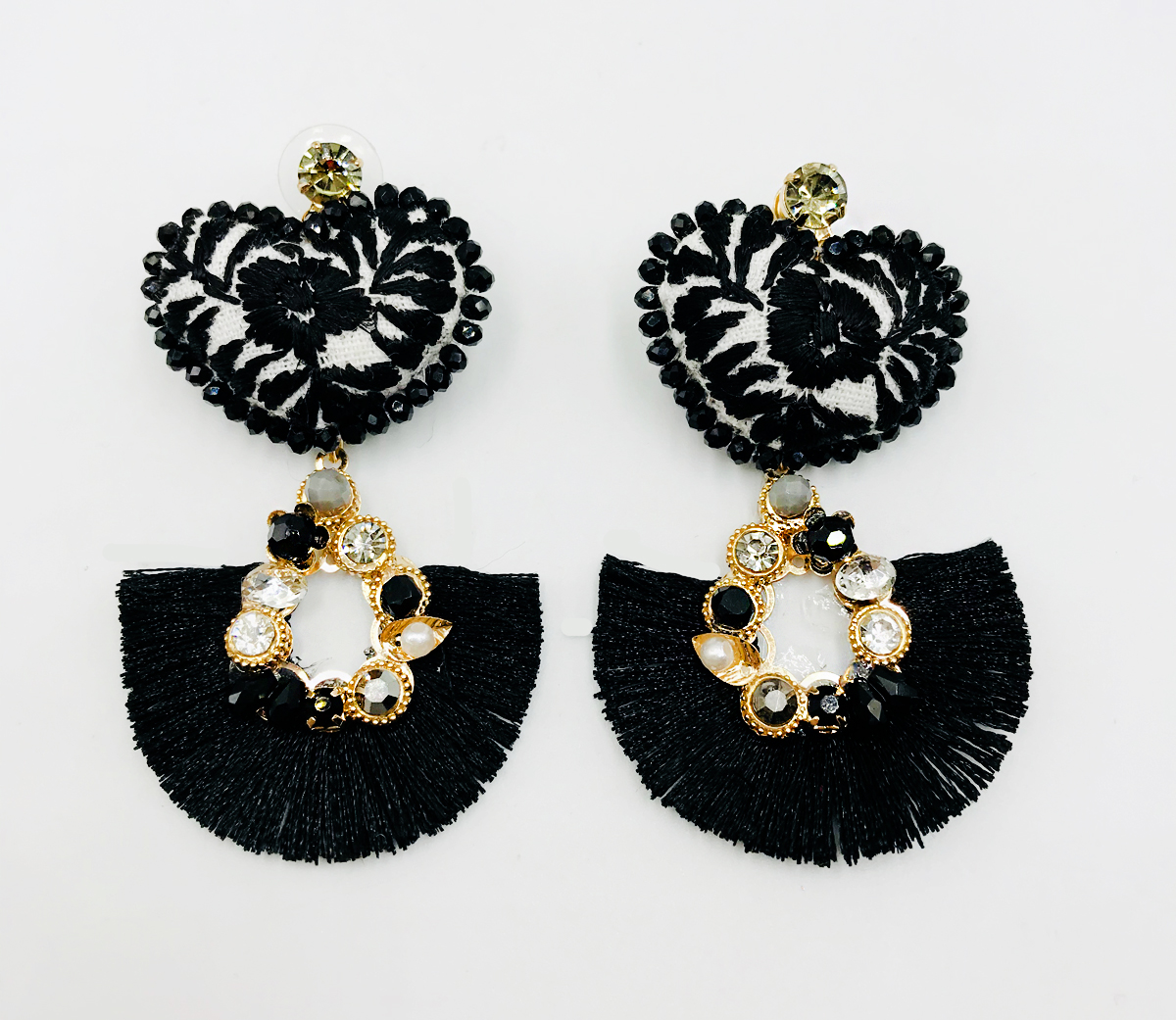 ARETES DE CORAZÓN BORDADOS A MANO CON TÉCNICA DE SAN ANTONINO CASTILLO VELASCO, OAXACA Y ESCOBILLA DE ABANICO CON CRISTALES.