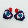 ARETES AROS METÁLICOS CON DECORADOS EN CRISTALES CON OJO TURCO EN MADRE PERLA Y MEDALLA DE FRIDA KAHLO. ESCOBA EN FORMA DE ABANICO. ACABADOS METÁLICOS DE BISUTERÍA.