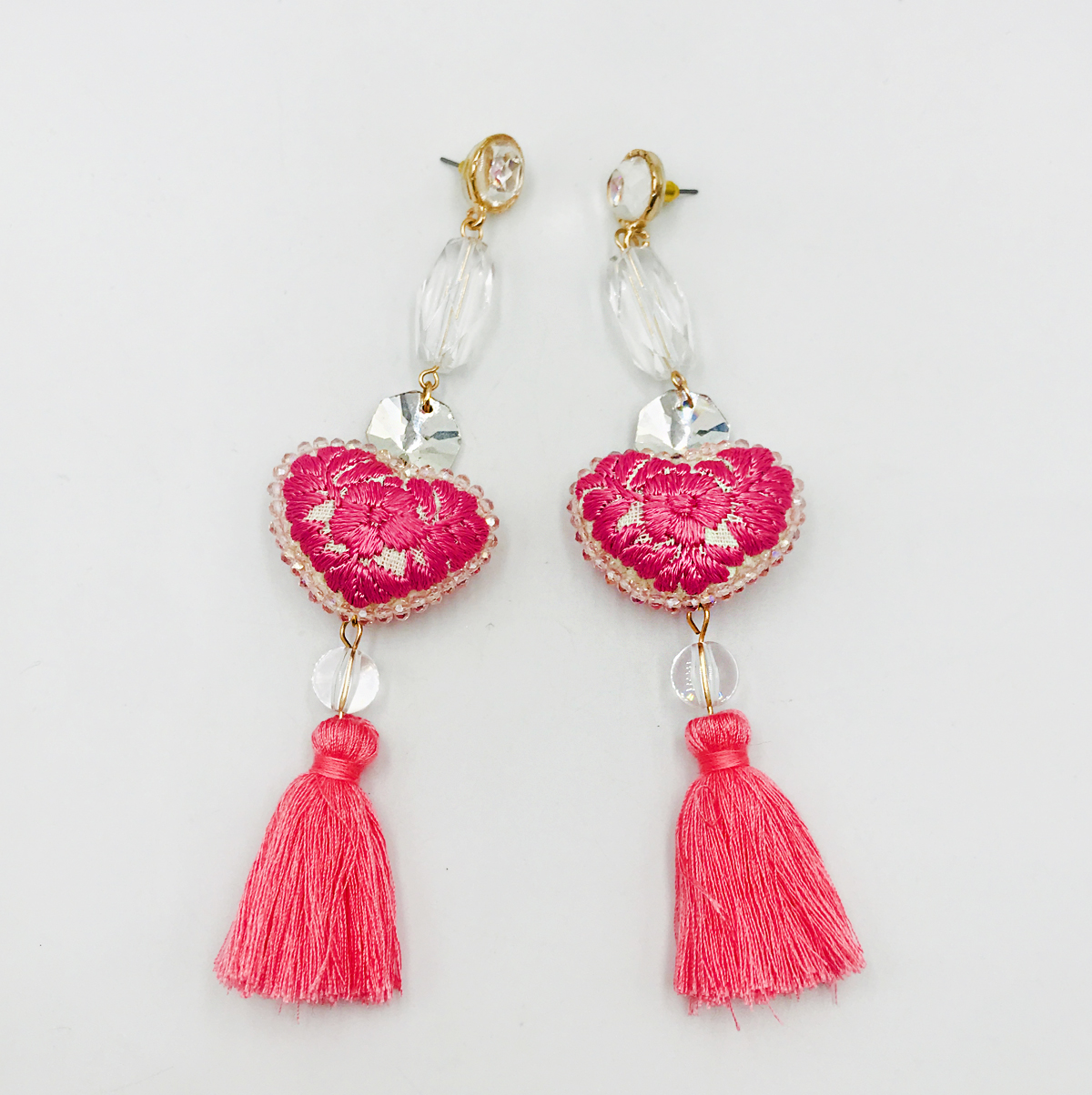 ARETES DE CORAZÓN BORDADOS A MANO CON TÉCNICA DE SAN ANTONINO CASTILLO VELASCO, OAXACA CON DIJE DE CONCHAS Y CRISTALES.