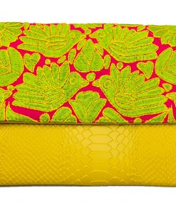 BOLSA CLUCTH GRANDE DE PIEL CON ACABADOS BORDADOS A MANO MANO CON TÉCNICA DE JALAPA DE DÍAZ, OAXACA Y CADENA.