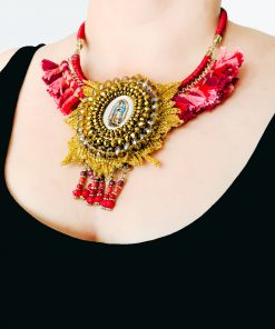 COLLAR CON MEDALLA DE LA VIRGEN DE GUADALUPE CON ESCOBILLAS DE HILO.