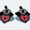 ARETES DE CORAZÓN BORDADO A MANO CON TÉCNICA DE SAN ANTONINO CASTILLO VELASCO, OAXACA, CON OJO TURCO EN CHAQUIRA, ESCOBILLAS ALREDEDOR EN FORMA DE ABANICO. ACABADOS METÁLICOS DE BISUTERÍA.