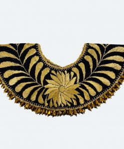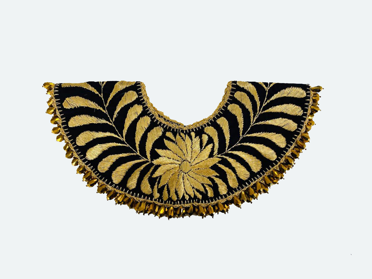 COLLAR LARGO DE CORAZÓN BORDADO A MANO CON TÉCNICA DE SAN ANTONINO CASTILLO VELASCO, OAXACA, CON CRISTALES, Y ESCOBILLA TIPO ABANICO.
